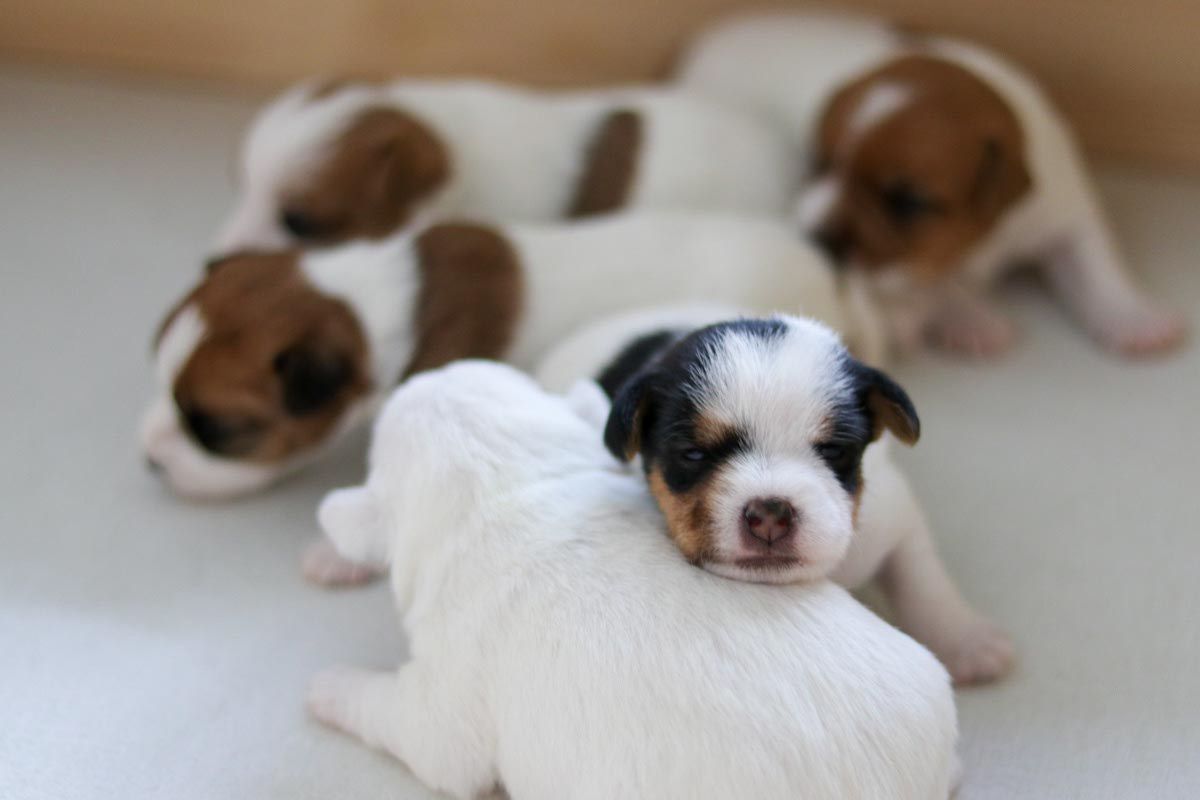 Noch in der Wurfkiste, aber deutlich aktiver :-)! Alle Welpen haben die Augen auf und ihre Schritte werden immer sicherer! Man kann schon ein paar erste Interaktionen untereinander beobachten.