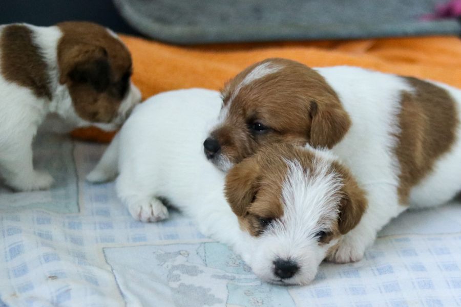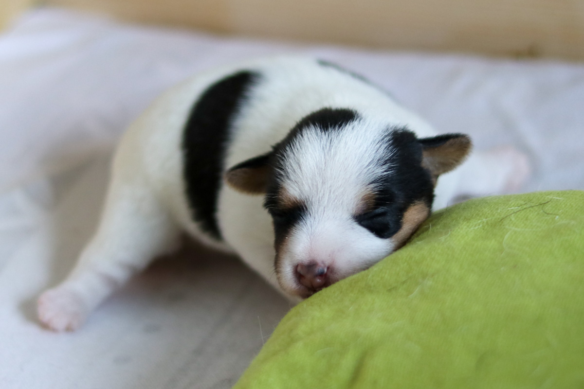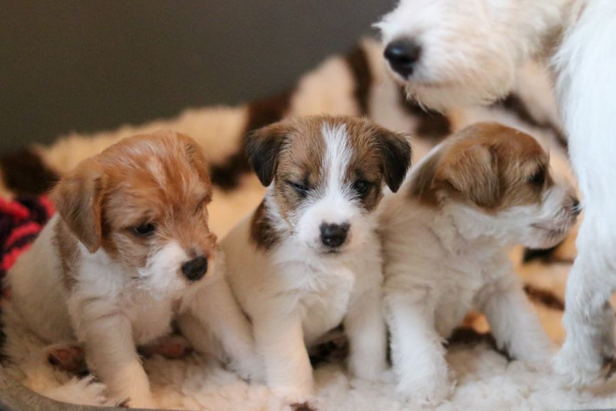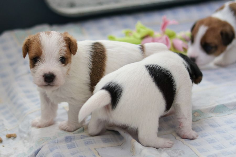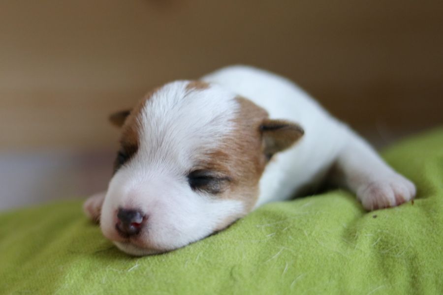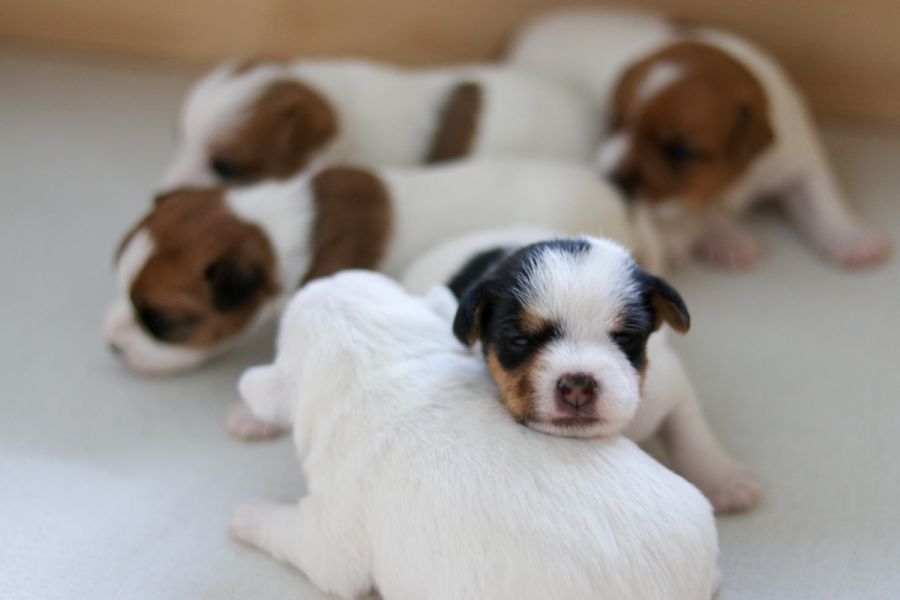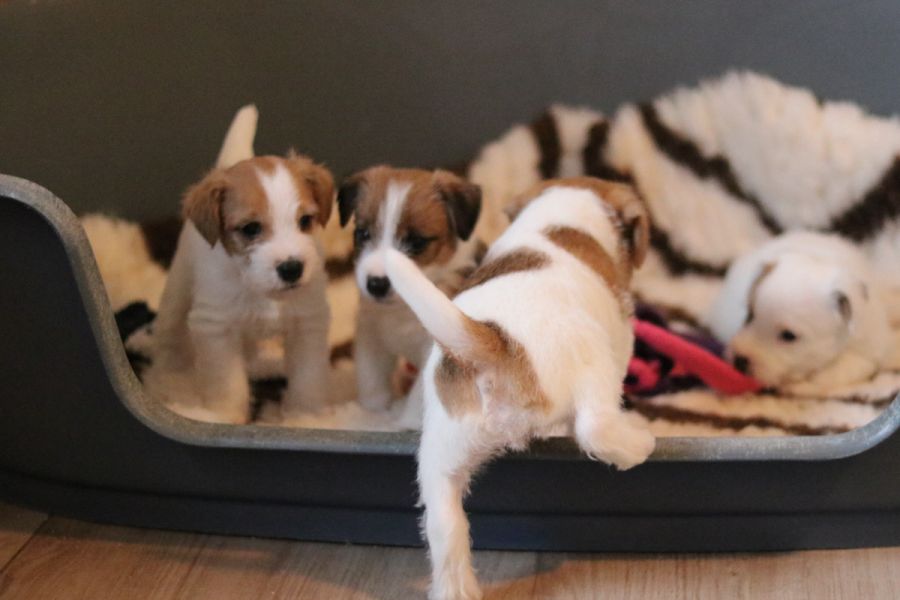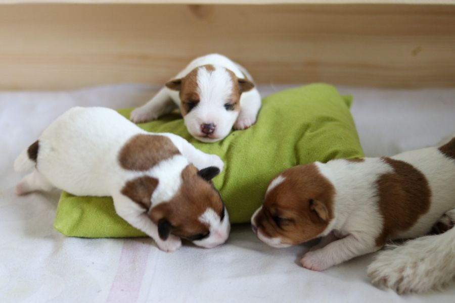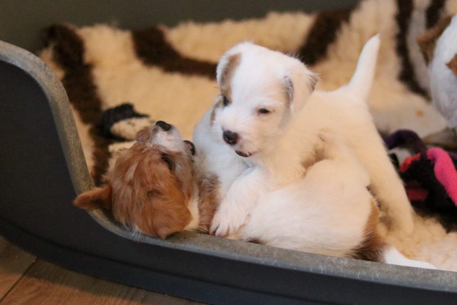 Noch in der Wurfkiste, aber deutlich aktiver :-)! Alle Welpen haben die Augen auf und ihre Schritte werden immer sicherer! Man kann schon ein paar erste Interaktionen untereinander beobachten...