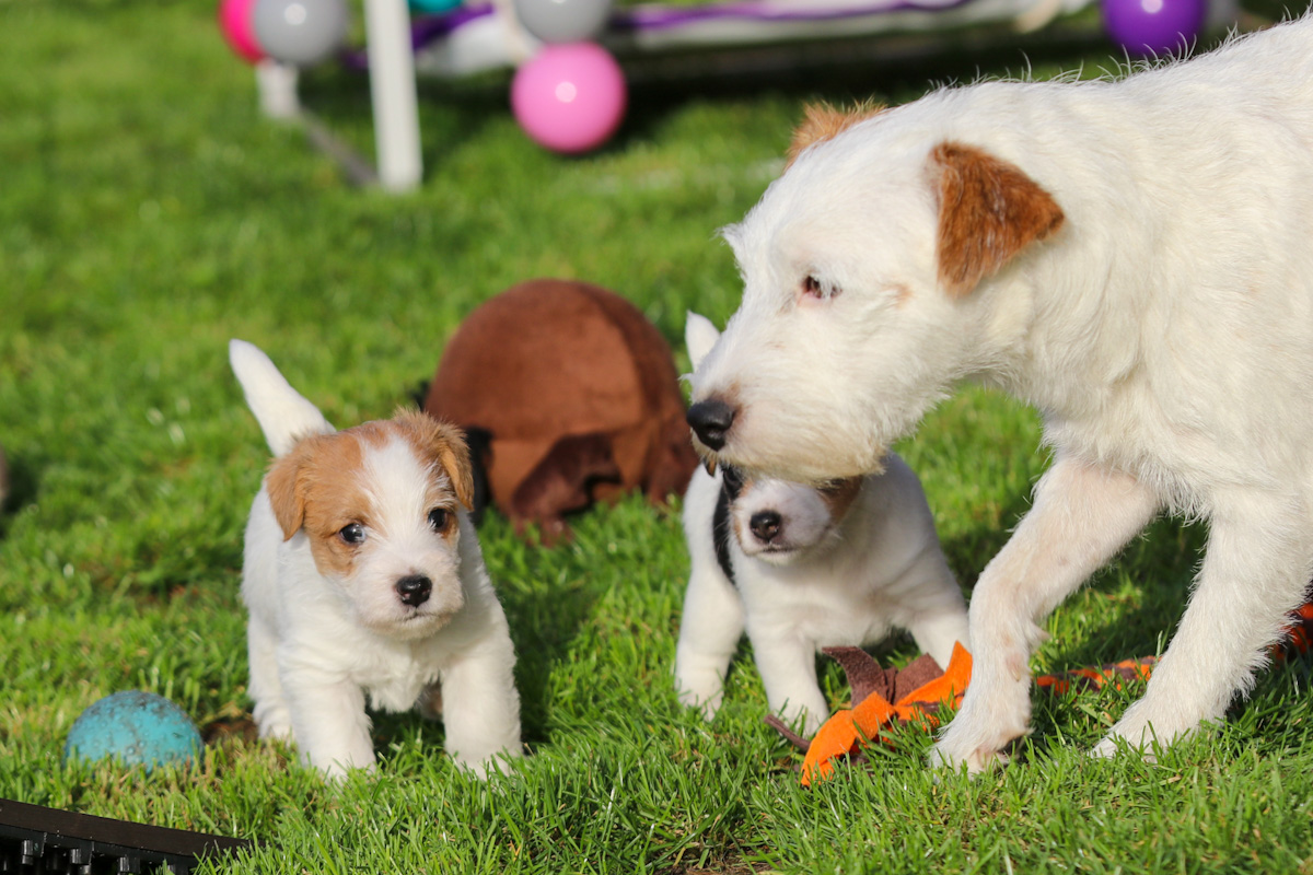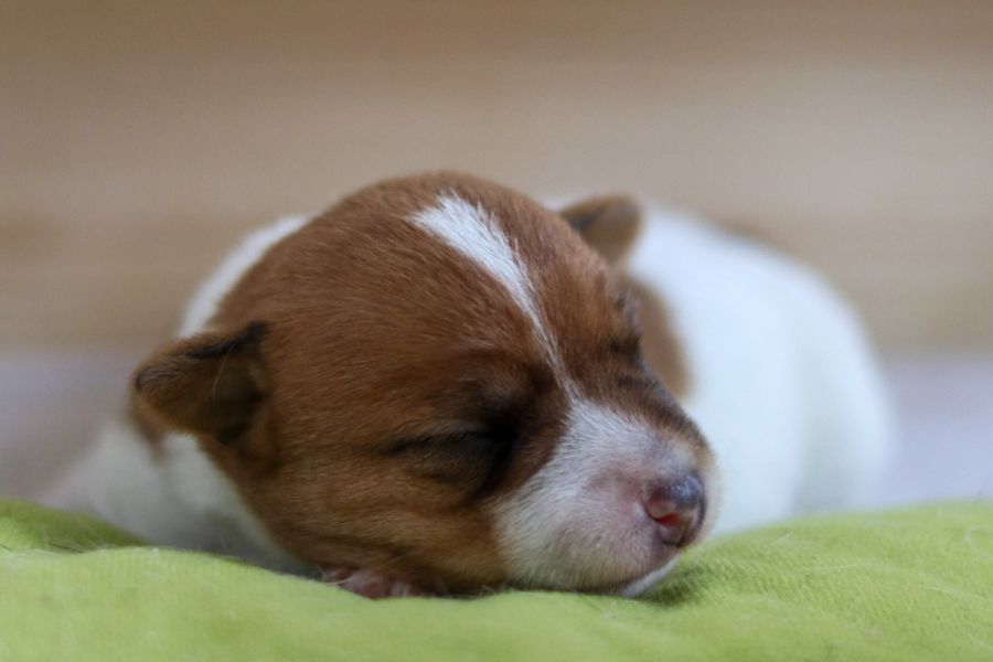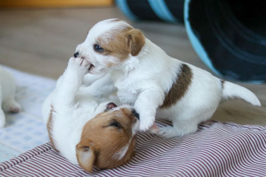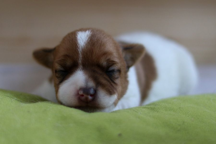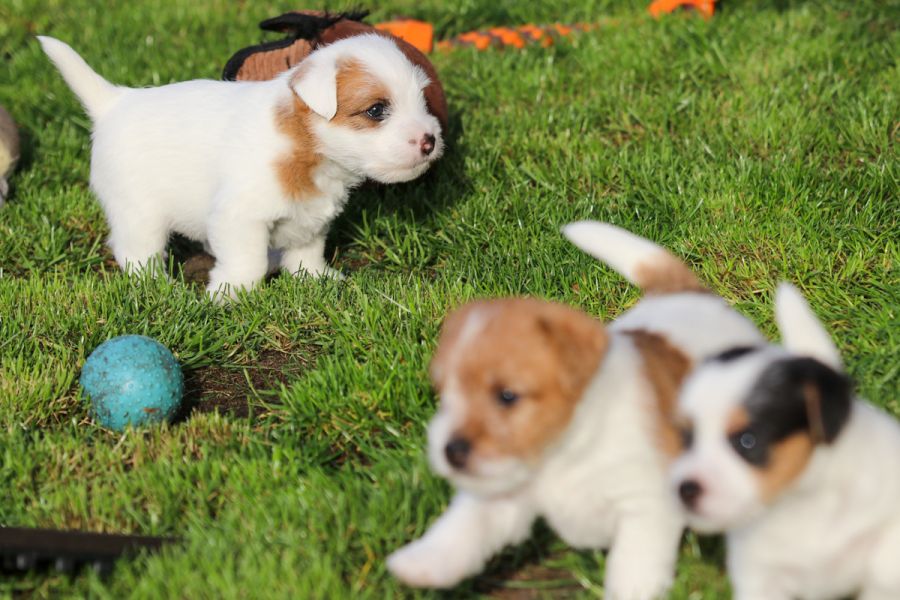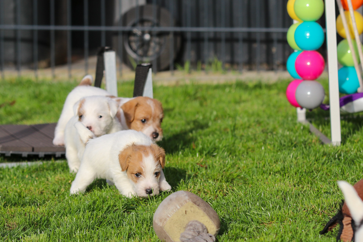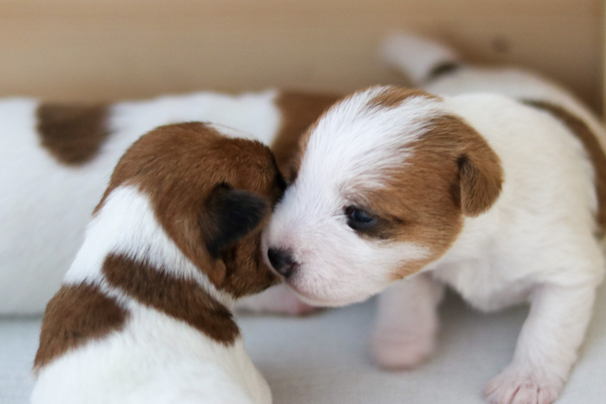Noch in der Wurfkiste, aber deutlich aktiver :-)! Alle Welpen haben die Augen auf und ihre Schritte werden immer sicherer! Man kann schon ein paar erste Interaktionen untereinander beobachten...
